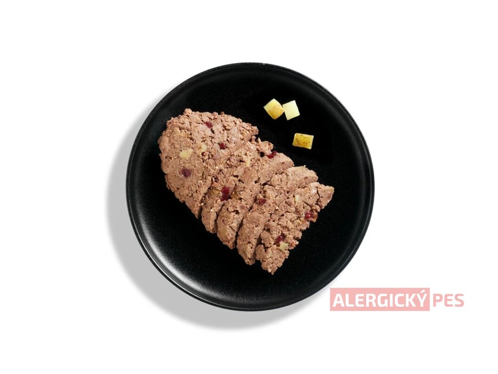 Čerstvé jehněčí maso (63 %, svalovina, játra, dršťky, plíce, srdce), jehněčí vývar (28 %), bramborový škrob (4 %), brusinky (4 %), světlicový olej (0,5 %), minerální látky (0,5 %)