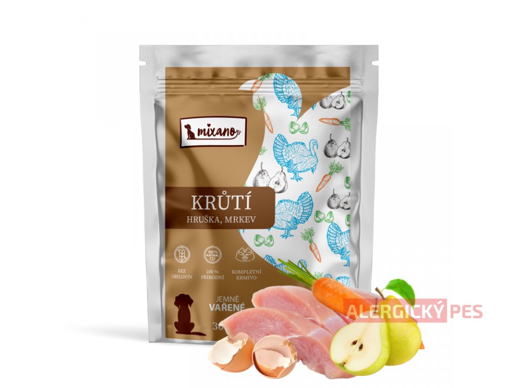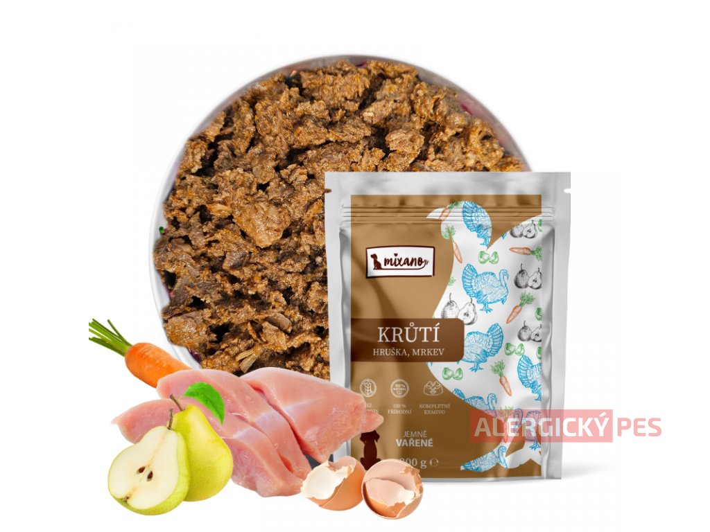 Jemně vařené krůtí Mixáno je poctivé masové krmivo připravené šetrným vařením při nízké teplotě, díky kterému si maso zachovává maximum živin, přirozenou chuť i vůni. Krůtí maso patří mezi nejlépe stravitelné druhy masa a je přirozeně hypoalergenní, proto je ideální volbou pro psy s citlivým zažíváním, potravními intolerancemi nebo při eliminační dietě.