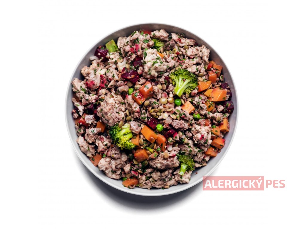 39% zelenina (mrkev, sladké brambory, zelená čočka, červená řepa, hrášek, květák a brokolice)